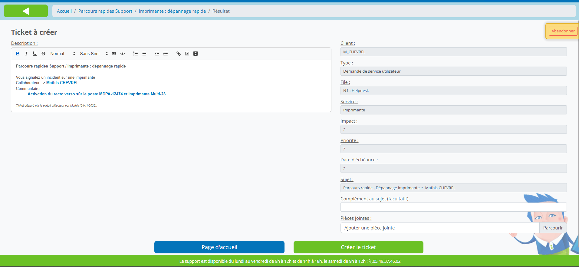 Dans le cas où aucun technicien n’est disponible pour reprendre l’appel, je demande à l’utilisateur de créer un ticket via la plateforme OTRS. Cela permet d’assurer que son incident soit bien enregistré, traité dans un délai raisonnable et qu’un technicien puisse le recontacter dès que possible. Cette procédure garantit une continuité de service, même en cas de forte affluence. À la fin de chaque appel qu’il s’agisse d’un incident ou d’une simple demande je crée un ticket rapide, qui s’ouvre et se résout automatiquement. Cela permet d’assurer une traçabilité complète de tous les appels reçus, même lorsque l’intervention ne nécessite pas de traitement supplémentaire. Cette démarche contribue à maintenir un suivi rigoureux de l’activité du support et à fournir une vision précise du volume et de la nature des sollicitations.