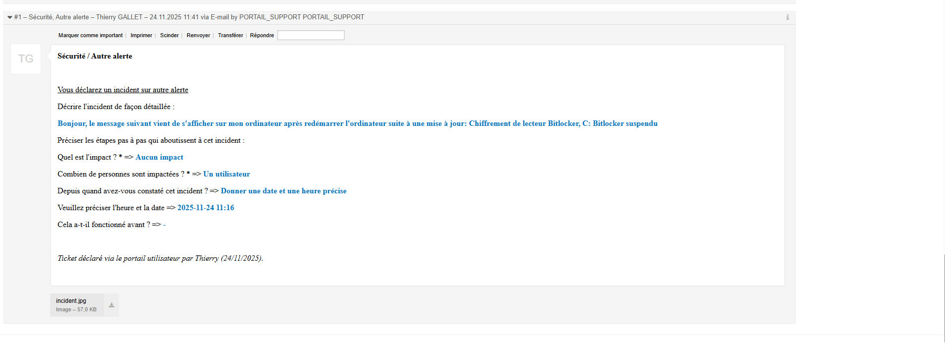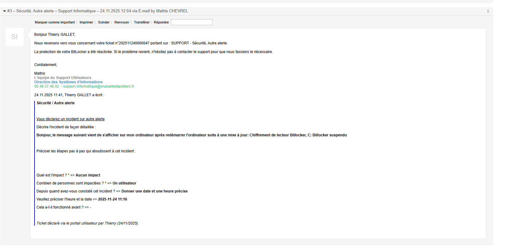 Si le diagnostic révèle que la résolution nécessite une intervention plus complexe ou des droits d’accès particuliers, j’effectue une escalade du ticket vers l’équipe compétente tout en informant l’utilisateur de la suite du traitement. Lors des appels téléphoniques, je me présente systématiquement, j’explique la raison de mon contact et je vérifie la disponibilité de l’utilisateur avant de commencer les manipulations. Une fois l’intervention effectuée, je recontacte l’utilisateur si nécessaire afin de réaliser les tests fonctionnels et de m’assurer que l’incident est complètement résolu. Lorsque le problème est résolu, je conclus l’échange poliment, puis je procède à la résolution du ticket dans OTRS, sans effectuer de clôture définitive. En effet, l’utilisateur dispose d’un délai de 7 jours pour réouvrir le ticket si l’incident réapparaît. J’y renseigne ensuite un compte rendu précis et détaillé des manipulations effectuées ainsi que des solutions apportées. Cette démarche garantit une gestion rigoureuse, efficace et parfaitement documentée des incidents.