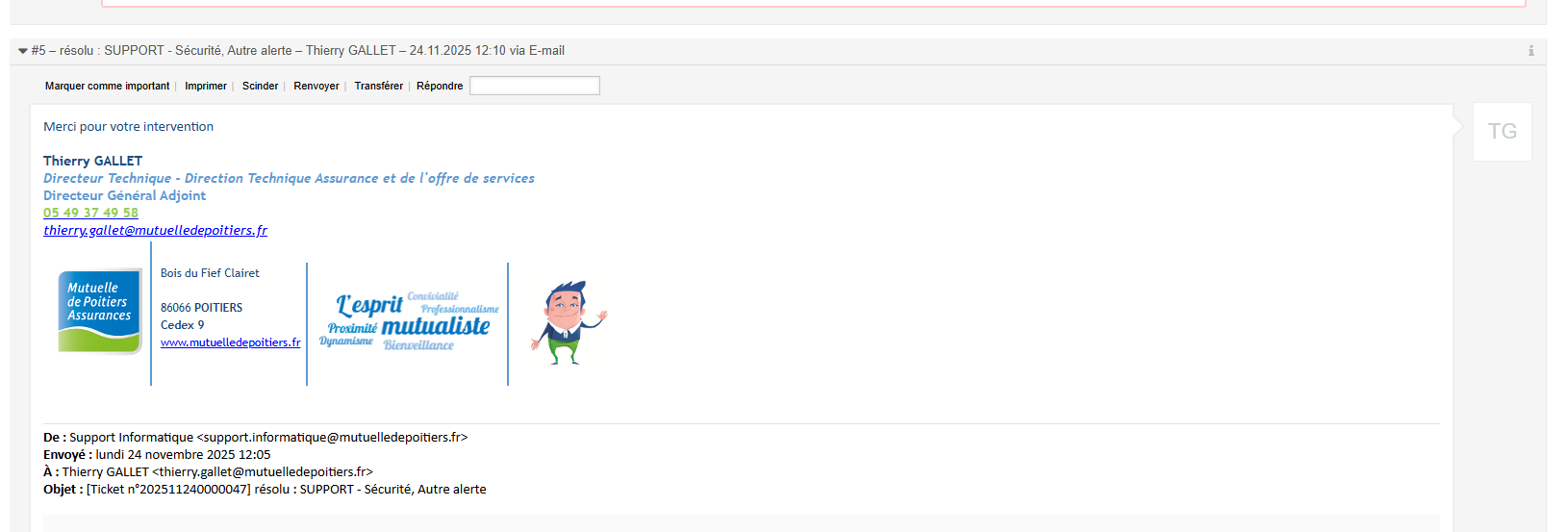 Dans le cadre de mon BTS SIO, j’assure le traitement des demandes d’assistance et des incidents utilisateurs au sein du support informatique de la Mutuelle de Poitiers. J’utilise quotidiennement la plateforme OTRS ainsi que la prise d’appels . Lorsqu’une demande est reçue, je commence par analyser avec précision le besoin ou l’incident afin de déterminer s’il s’agit d’un problème logiciel, matériel, réseau ou d’une simple demande de service. Je procède ensuite à la qualification du ticket dans OTRS en sélectionnant les catégories appropriées et en attribuant le niveau de priorité correspondant aux règles établies.